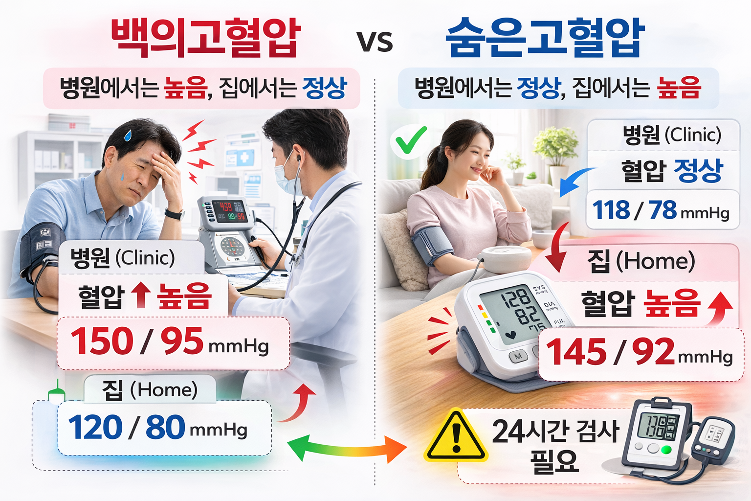 이걸 **백의 고혈압(White Coat Hypertension)**이라고 한다.